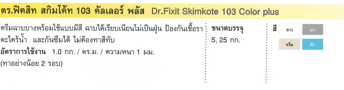ครีมฉาบบางพร้อมใช้แบบมีสี Dr.Fixit Skimkote 103 Color Plus ผลิตภัณฑ์กันซึม วัสดุยาแนวรอยต่อ ผลิตภัณฑ์งานซ่อมแซมและฉาบบาง กระเบื้องและวัสดุยึดประสาน เกร้าท์และวัสดุเจาะเหล็กเสียบ ผลิตภัณฑ์เคลือบผิวและสี บริษัท เอเชีย วอเตอร์สต๊อป โปรดักส์ จำกัด